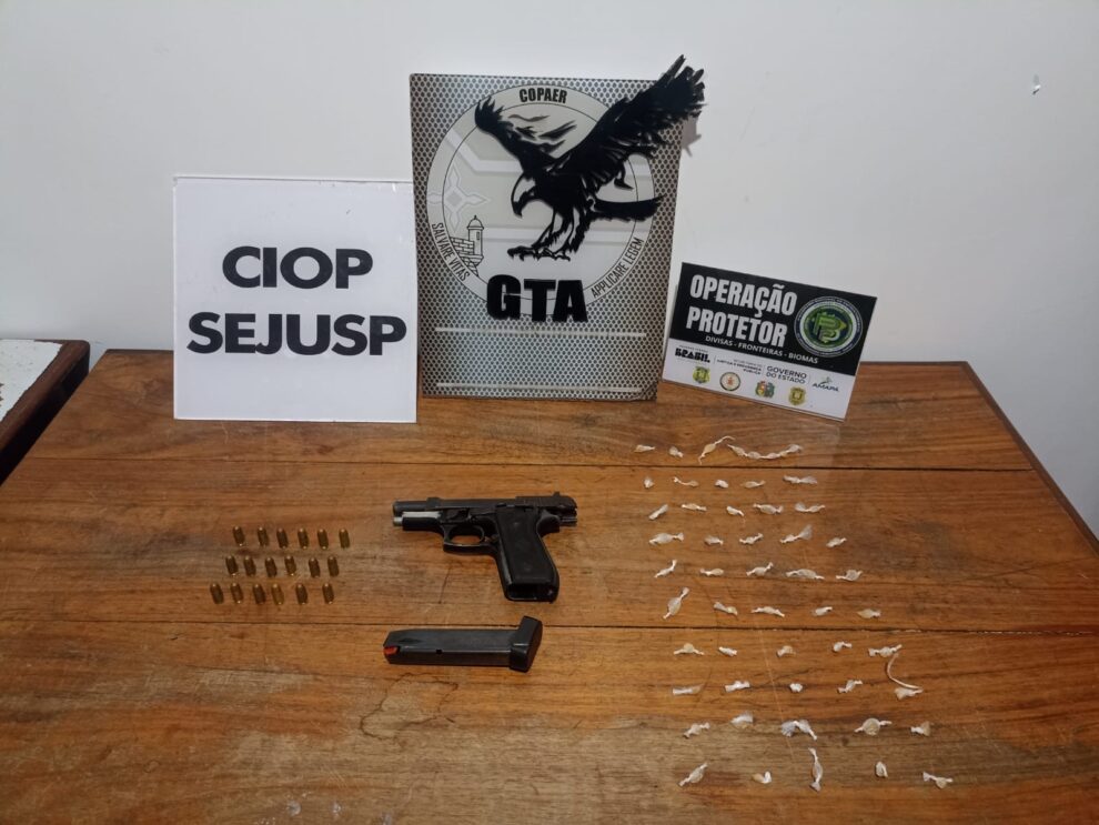 Houve troca de tiros e o suspeito foi alvejado. Com ele, os policiais encontraram uma pistola calibre .380 com numeração raspada, 18 munições intactas, dois celulares e um pote contendo 53 porções de crack prontas para venda.
