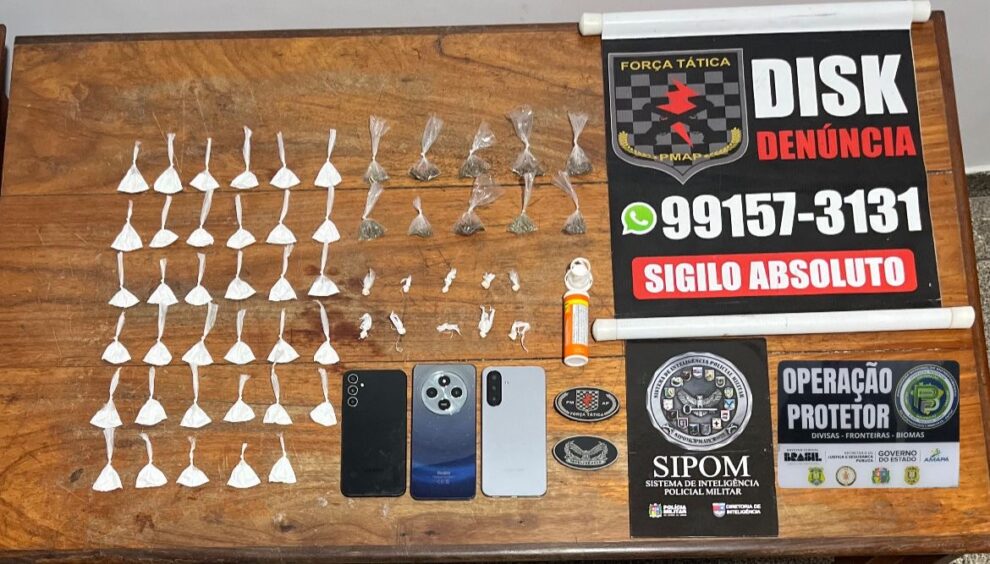 Informações repassadas pelo setor de Inteligência da PMAP apontaram movimentações ligadas ao tráfico, o que motivou novas diligências das equipes. As policiais localizaram as duas envolvidas com 55 porções de drogas, entre maconha, crack e cocaína, todas prontas para serem distribuídas.