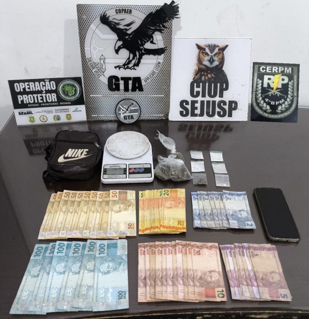 Com ele, foram apreendidos entorpecentes, balança de precisão, dinheiro e um celular, material que reforça a suspeita de atuação no tráfico local.