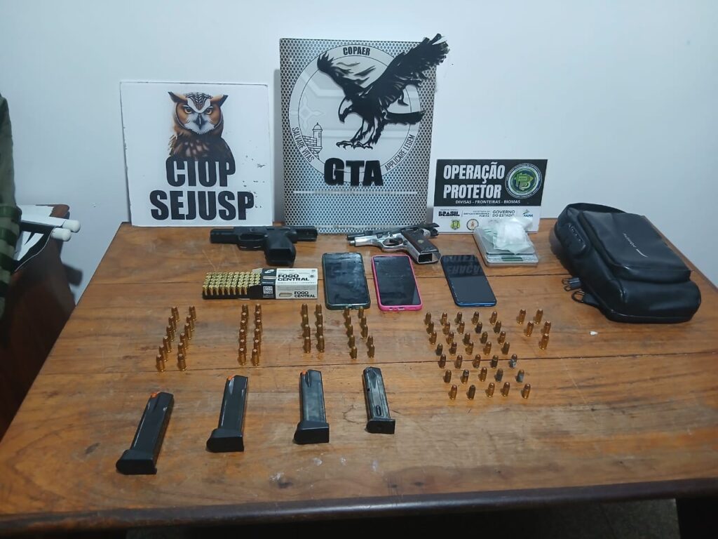 Com o suspeito, os policiais encontraram 95 munições calibre .380 e 37 munições calibre .40, duas pistolas, três carregadores de .40, um carregador de .380, uma balança de precisão, além de sacolas utilizadas para embalar entorpecentes e uma bolsa preta.